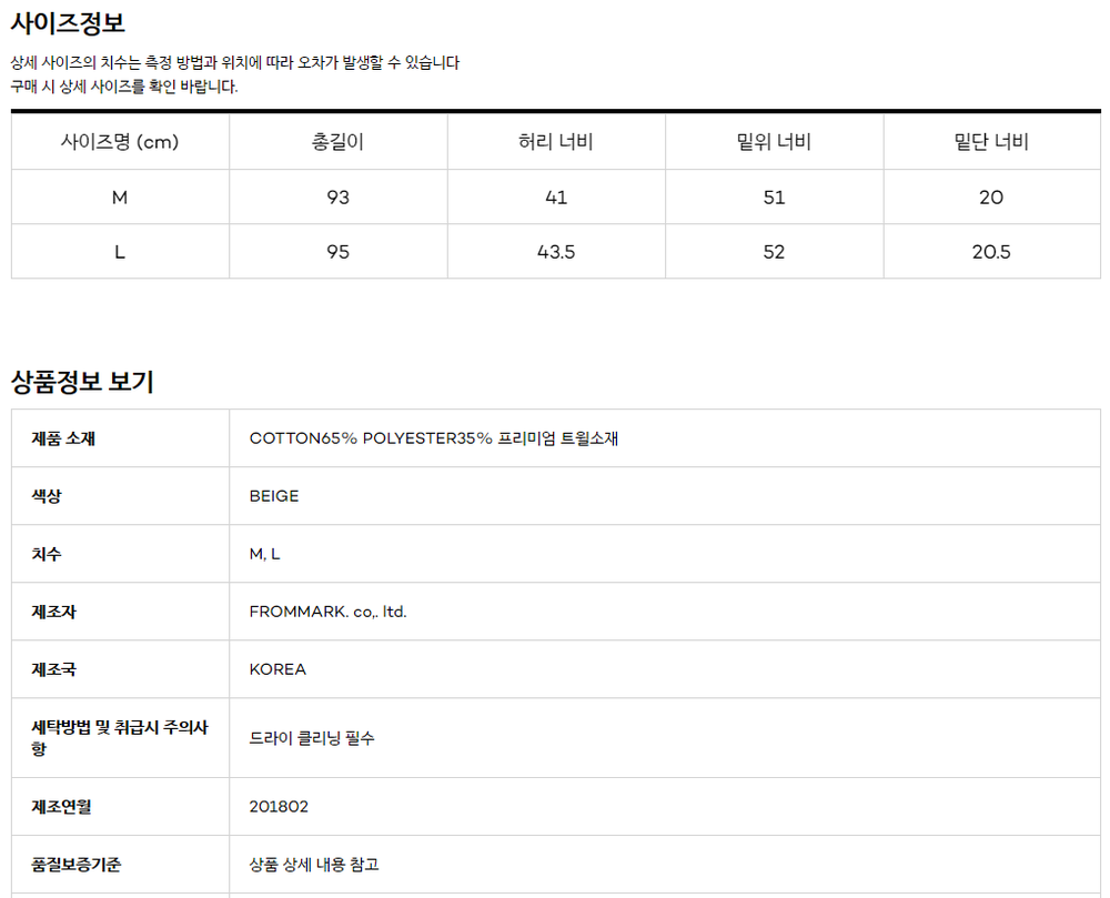 L : 총길이 95, 허리 43.5, 밑위 52, 밑단 20.5